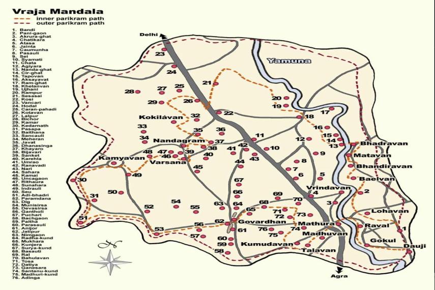 • Eastern side of Yamuna: Madhuvana, Talavana, Kumudavana, Kamyavana, Bahulavana, Vrindavana, Khadiravana